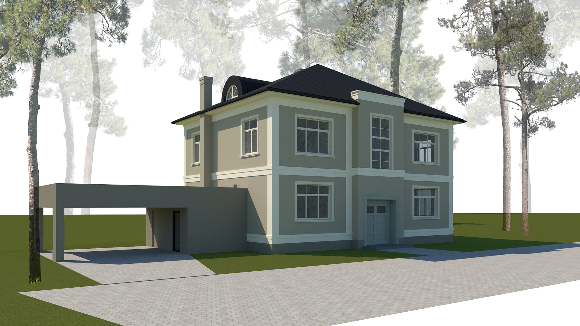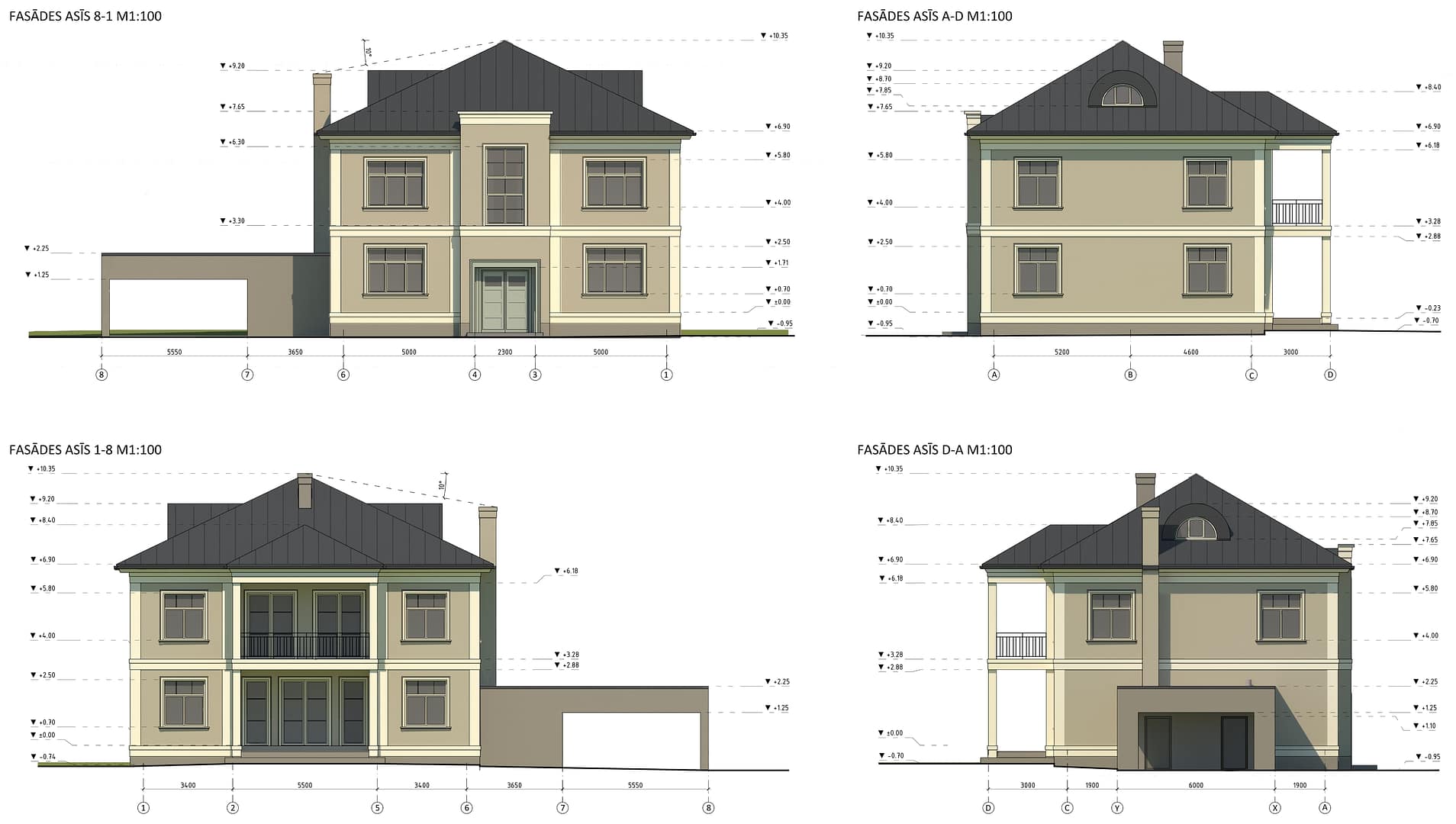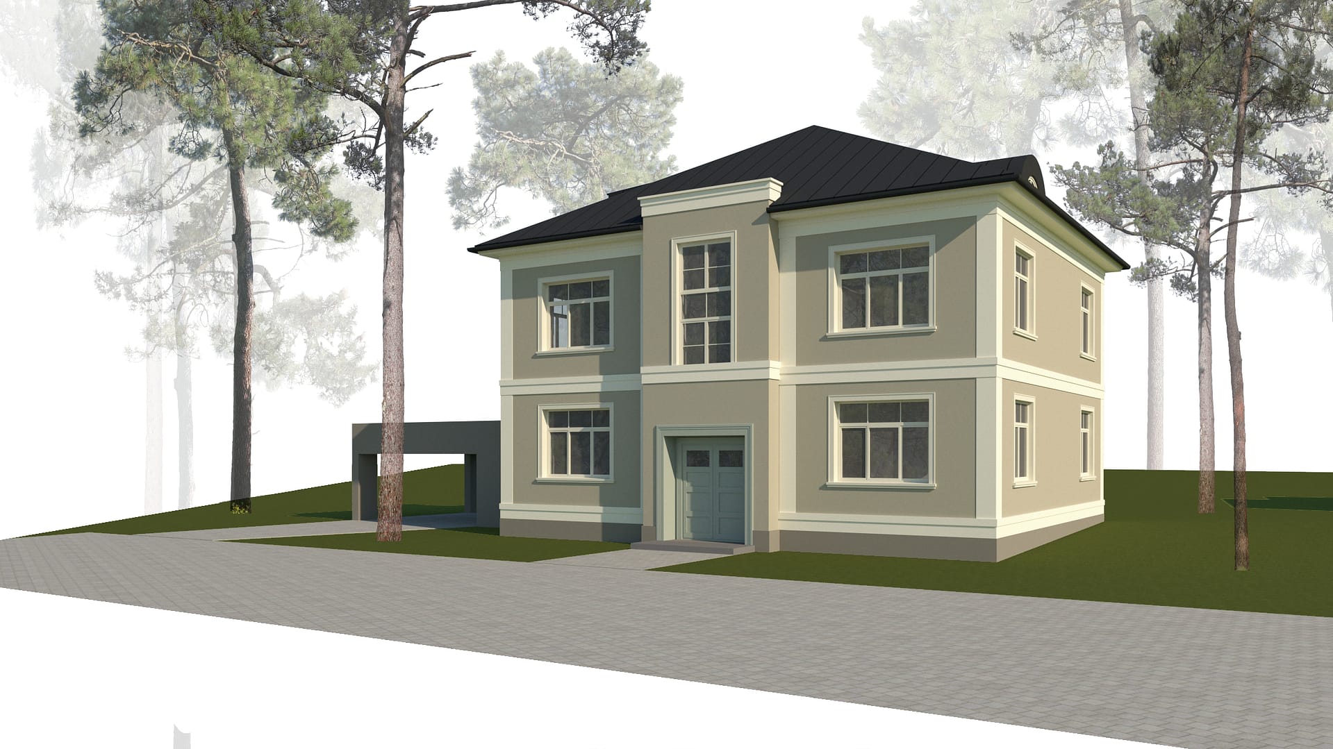The building to be renovated consists of two volumes. The residential volume is designed in a manner characteristic of the surrounding development, while the side volume is simple in form and unaccented. The building is intended to preserve the established building footprint and location. Two apartments will be created on each floor, along with the construction of a basement and roof extension. The apartment layout includes a kitchen, living room, 2 bedrooms, 2 bathrooms, and covered terraces. The building’s facades are planned to be plastered with vertical and horizontal accent stripes. The tones range from light beige to dark beige, with the entrance portal in a greenish hue. The windows are designed with divisions that correspond to the surrounding environment. The roof is planned to be covered with dark grey metal sheets. The side volume houses a technical room and auxiliary space, as well as a prospective shelter for car parking